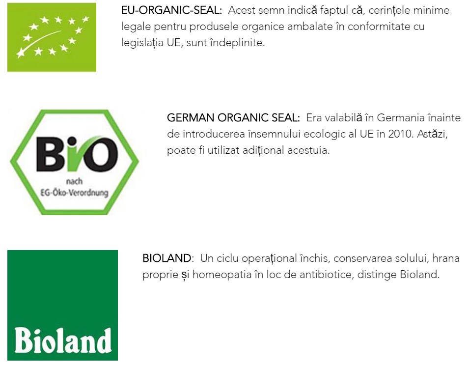 Dacă doriți produse 100% ecologice, de obicei, trebuie să cheltuiți mai mult. Produse cu etichete precum Bioland, Naturland sau Demeter, de exemplu, sunt produse după reguli mai stricte. Unele dintre aceste standarde ecologice depășesc cu mult liniile directoare prevăzute în Regulamentul ecologic al UE.