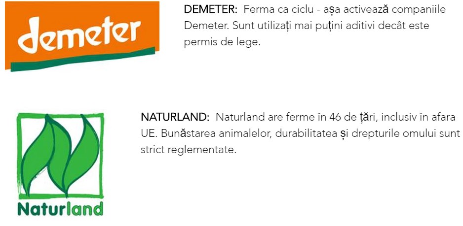 Un exemplu: Regulamentul ecologic al UE permite aproximativ 45 de aditivi în produsele etichetate conform acestuia. Bioland este limitat la 22 aditivi, Demeter la doar 20 de aditivi.