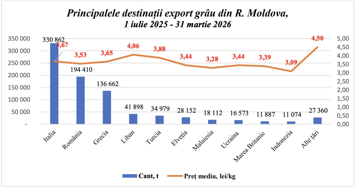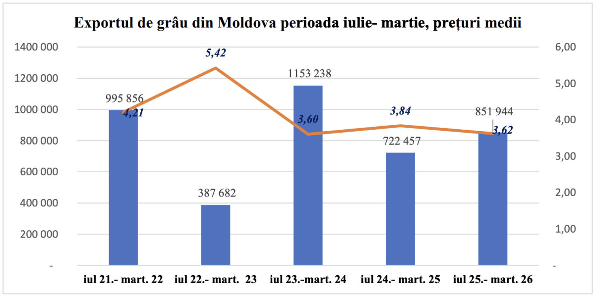 În perioada iulie 2025 – martie 2026, Republica Moldova a exportat 851 944 tone de grâu, cu 18% mai mult față de cele 722 457 tone din sezonul precedent.
