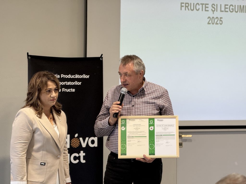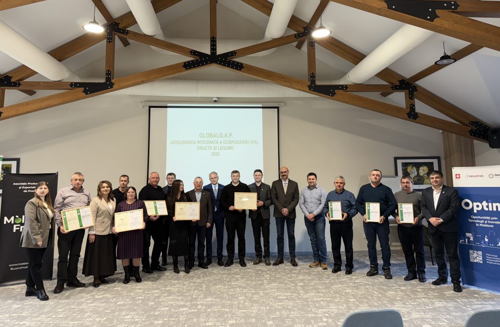 Obținerea certificării internaționale GLOBALG.A.P. este rezultatul unui program amplu de instruire, mentorat și asistență tehnică, derulat pe parcursul anului 2025, sub coordonarea Asociației Moldova Fruct, cu sprijinul Elveției și al organizației Helvetas Moldova.