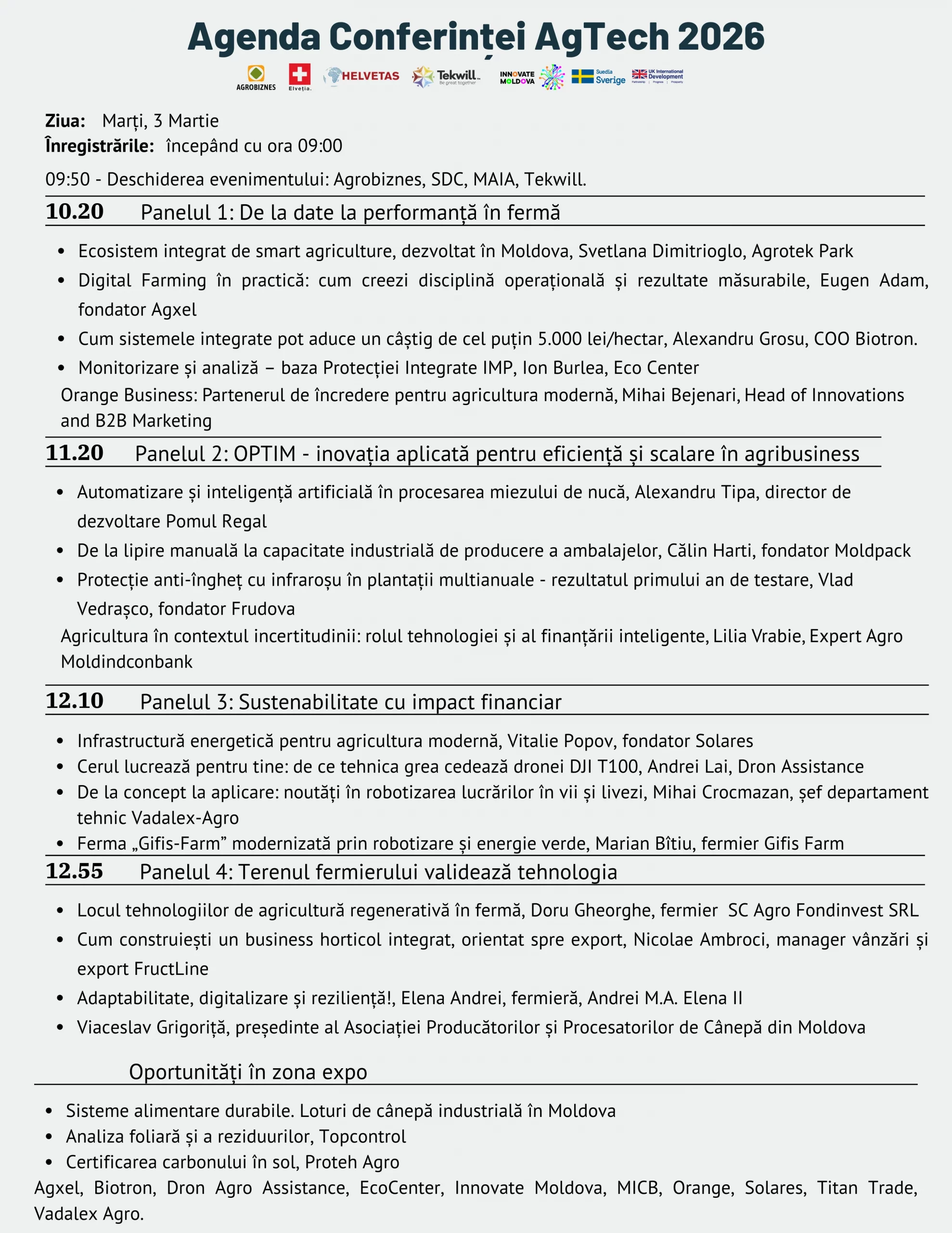 Agxel, Biotron, Dron Agro Assistance, EcoCenter, Innovate Moldova, MICB, Orange, Solares, Titan Trade, Vadalex Agro.