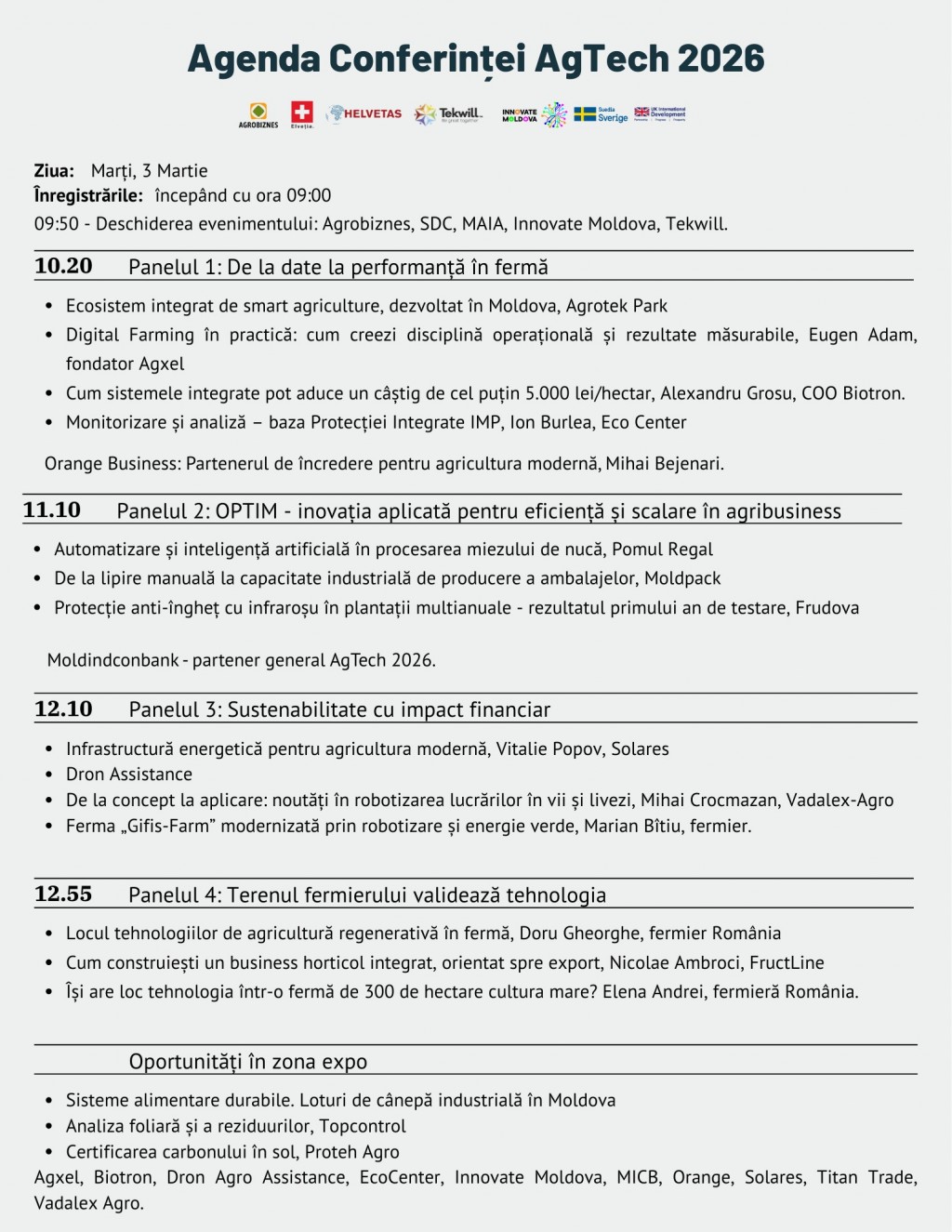 Pe 3 martie, marți, comunitatea agribusiness-ului din Republica Moldova se reunește la Tekwill la o nouă ediție a Conferinței AgTech, eveniment pe care îl organizăm de ani buni și care a devenit un reper pentru fermieri, antreprenori și furnizori de tehnologie.