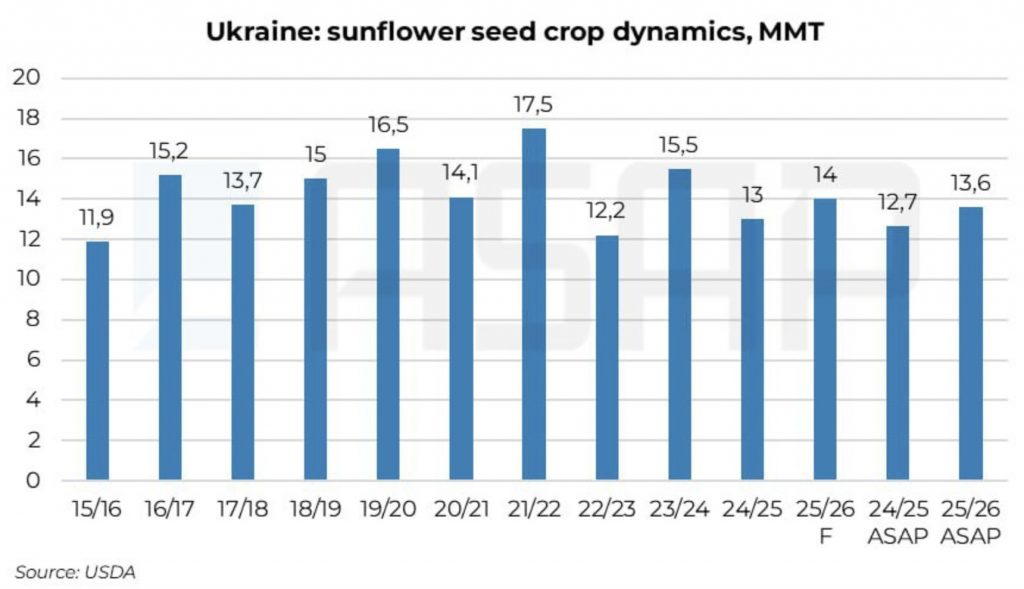 Producția de floarea-soarelui în Ucraina ar putea scădea la 13,6 milioane de tone în sezonul 2025/26, potrivit estimărilor companiei ASAP Agri. Prognoza a fost ajustată în jos din cauza secetei prelungite, anterior fiind estimată la 14,1 milioane de tone.