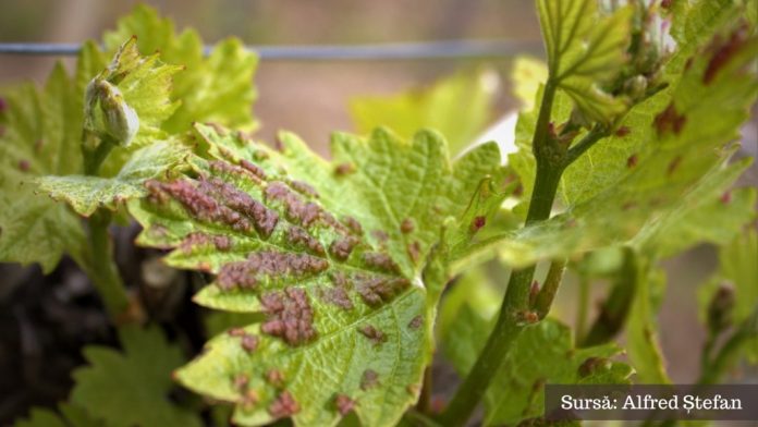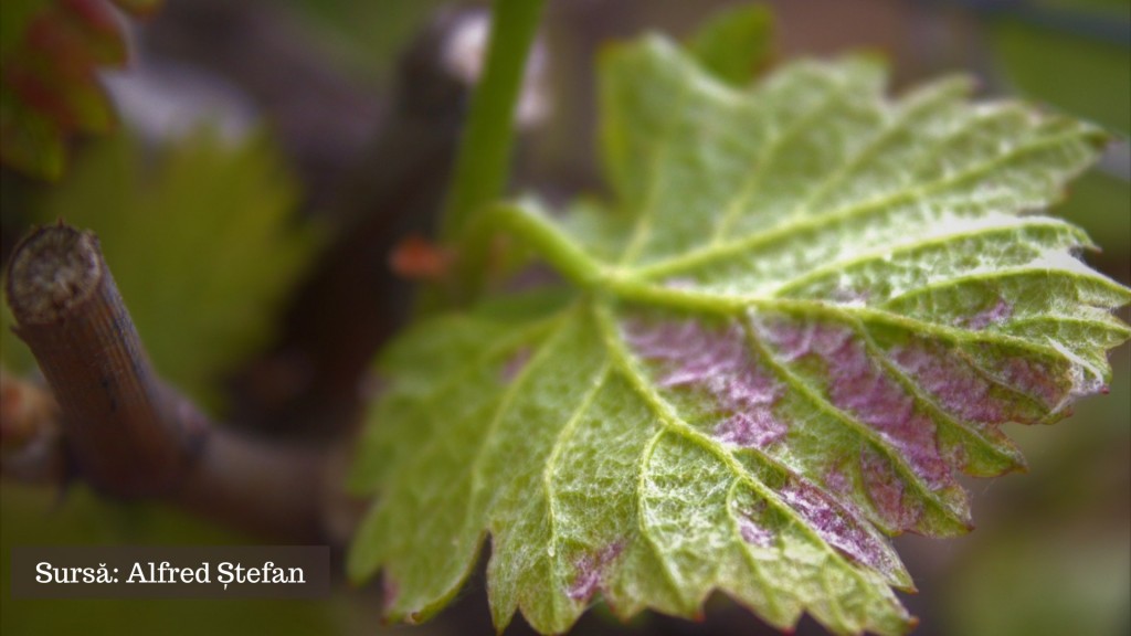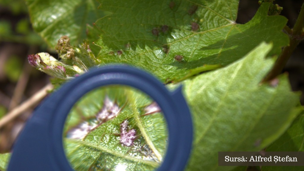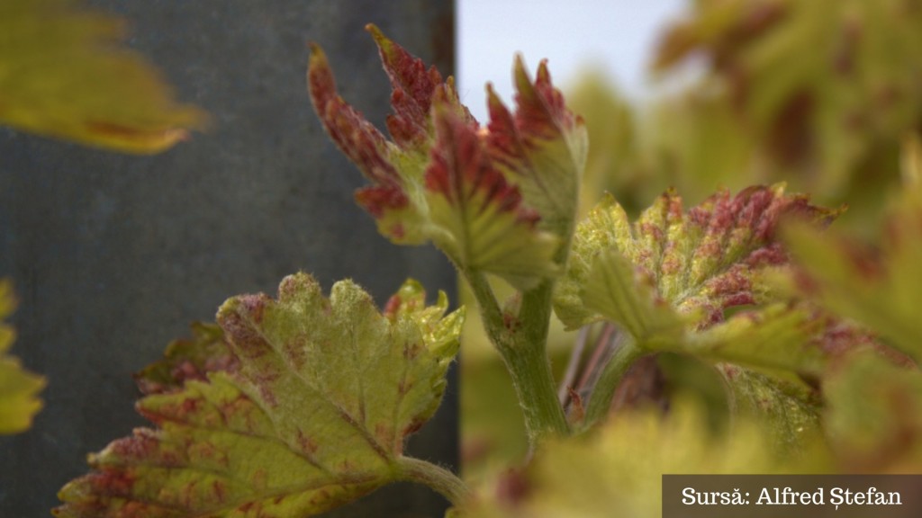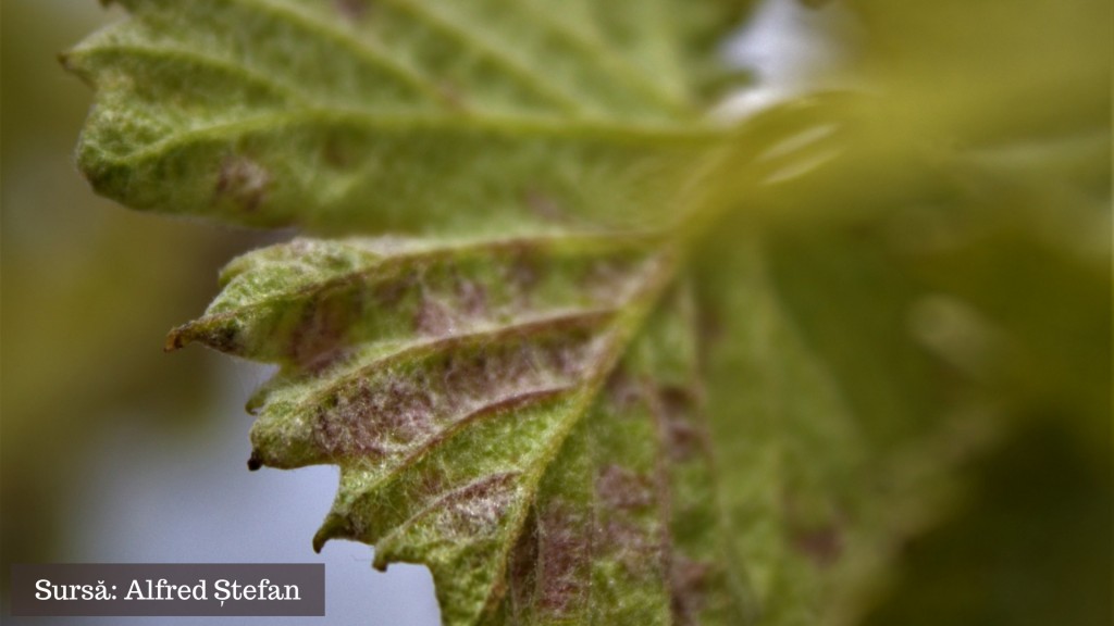 Pe partea superioară bășicări de culoare mai închisă decât restul frunzei – la început de culoare alb-gălbuie, alb-rozalie sau gălbui-roșiatice (în funcție și de soiul de viță de vie), iar mai târziu devin brun-cafenii.