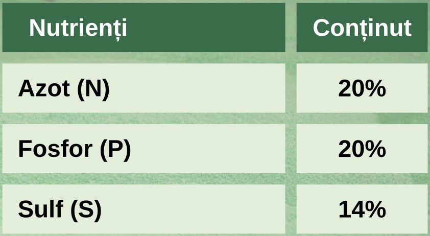 Produsul favorizează formarea sistemului radicular și susține creșterea timpurie, putând fi aplicat prin împrăștiere la suprafața solului sau încorporat concomitent cu semănatul.