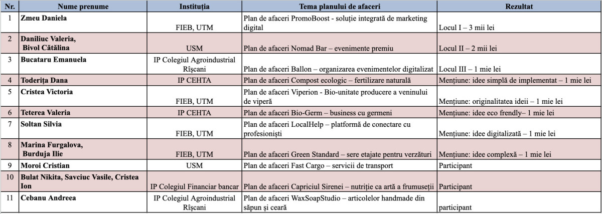Participanții au prezentat 11 planuri de afaceri, caracterizate prin abordări moderne, componente digitale și soluții orientate spre eficiență și valorificarea resurselor locale. Proiectele au fost apreciate pentru nivelul de argumentare și aplicabilitate.