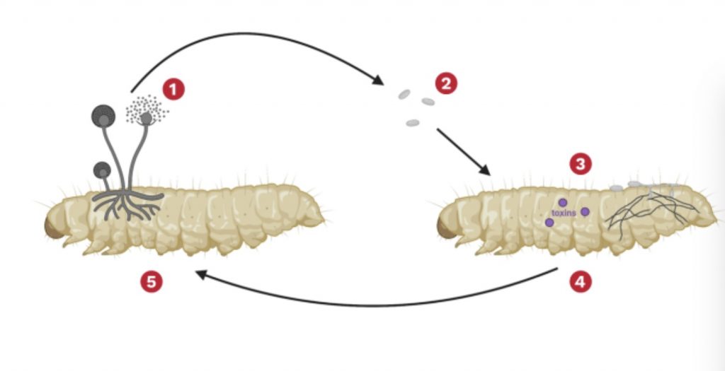 Sporii ciupercii entomopatogene pătrund în corpul insectei prin cuticulă, apoi germinează în interior, perturbând circulația hemolimfei și secretând toxine. După răspândirea miceliului, ciuperca formează noi spori, care infectează alte exemplare.