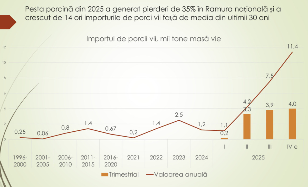 Totuși, anul 2025 a adus o schimbare abruptă, marcată de pierderi de aproximativ 35% ale producției, pe fondul focarelor de pestă porcină africană.
