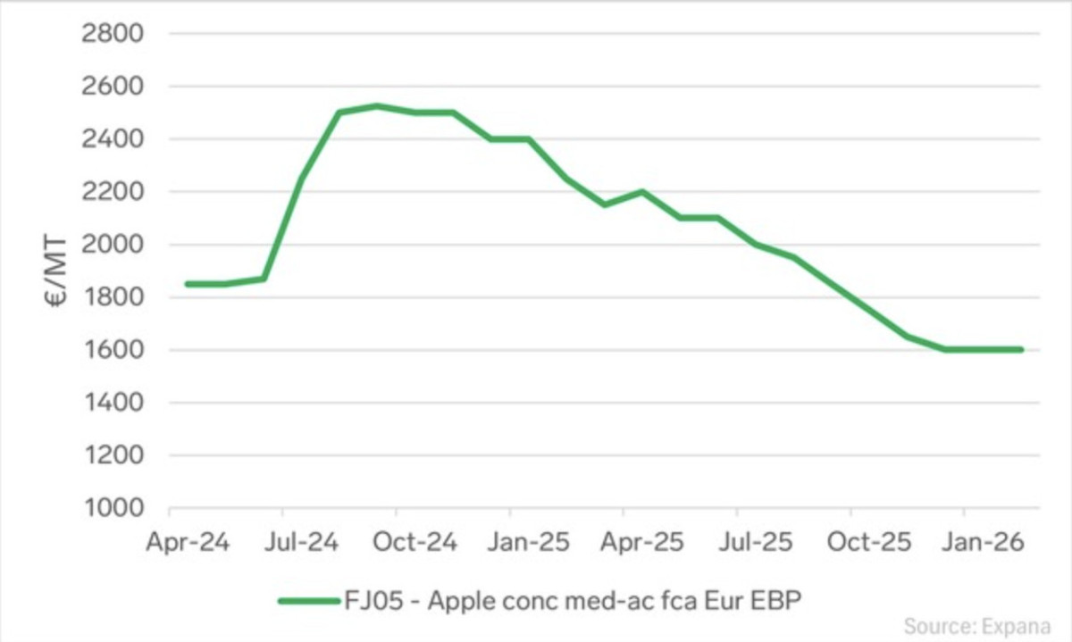Prețul pentru concentratul de mere cu aciditate medie FCA Europa, origine Polonia, era de 1.600 euro/tonă (1.728 USD) la 27 februarie, nemodificat față de luna precedentă, dar în scădere cu 28,9% față de anul anterior.