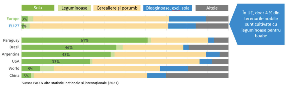 Ponderea suprafețelor cultivate de culturi anuale în UE și alte țări producătoare de soia și leguminoase.