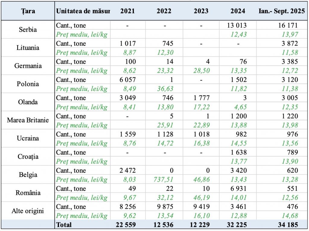 Dacă în 2022–2023 importurile nu depășeau 13 mii tone/an, în 2024 s-a ajuns la 32,2 mii tone, iar în perioada ianuarie–septembrie 2025 – la 34,1 mii tone.