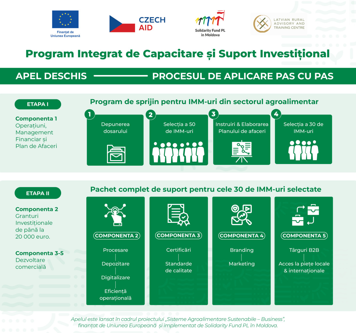 Apelul este lansat în cadrul proiectului „Sisteme Agroalimentare Sustenabile – Business” finanțat de Uniunea Europeană și implementat de Solidarity Fund PL în Moldova, ca parte a Inițiativei Echipa Europa „Sisteme Agroalimentare Sustenabile”, realizată în colaborare cu Agenția Cehă pentru Dezvoltare și Centrul Leton de Consultanță și Formare Rurală.