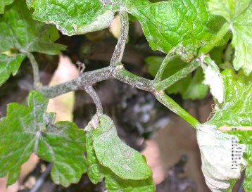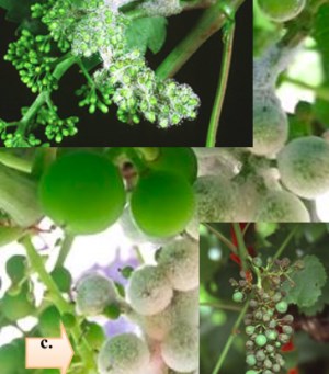 - Făinarea viței de vie (Oidiumul) – agentul patogen este ciuperca ascomicetă Uncinula necator Burril. Atacă lăstarii, frunzele, boabele ciorchinelui (figura 10.2).