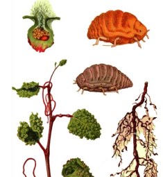 Filoxera viței de vie – Viteus vitifoliae / Philloxera vastatrix, acest dăunător cel mai des atacă frunzele de la vârful lăstarilor și rădăcinile la hibrizii producători direcți și frunzelor de la vârful lăstarilor la plantațiile de portaltoi (figura 11.1).