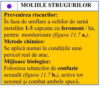 Eudemisul și cochilisul viței de vie (Moliile strugurilor) – Lobesia botrana, Eupoecilia ambiguella, sunt cei mai periculoși dăunători și pot avea 2-3 generaţii pe an (mai-iunie, iunie-iulie, august-septembrie), forma larvară fiind cea care produce daunele (figura 11.3).