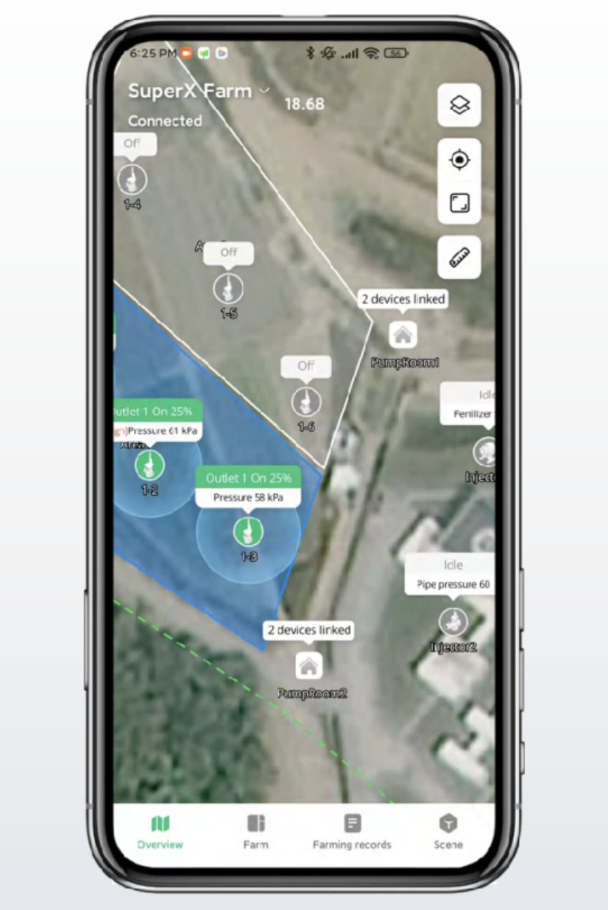 Aplicația XAG Farm oferă acces permanent la datele de irigare și fertigare, la starea echipamentelor și la alerte instant în caz de probleme.