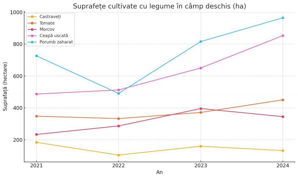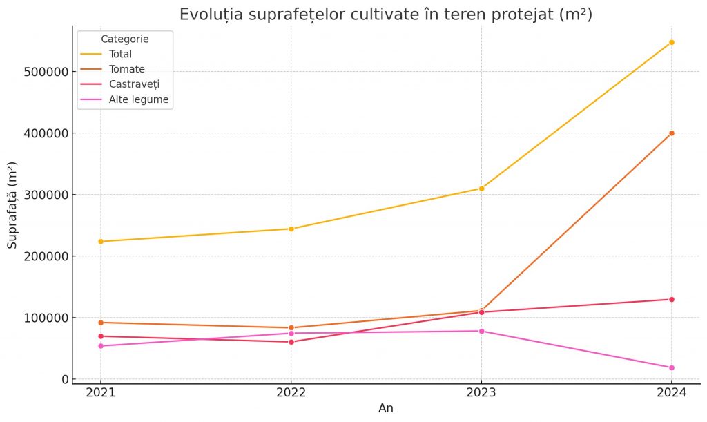 Această creștere este datorată în special extinderii culturilor de tomate, care au ajuns de la 91.858 m² în 2021 la peste 399.000 m² în 2024 — o creștere de peste patru ori.