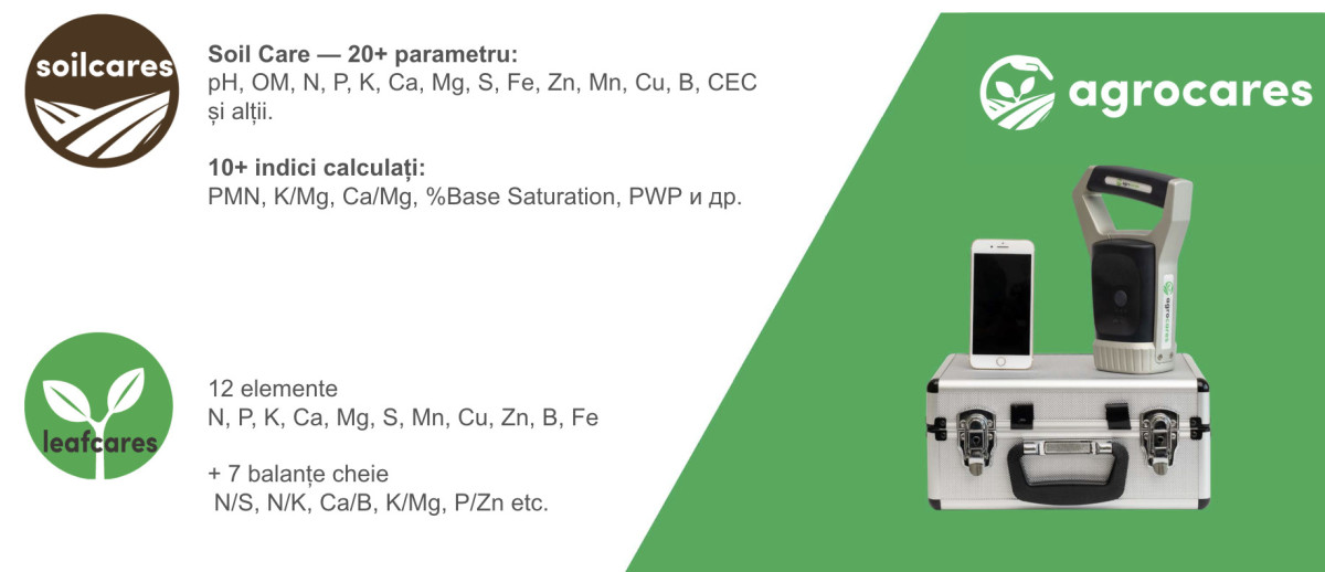 Modulul SoilCares permite efectuarea analizei rapide a solului direct în câmp. Scannerul determină peste 20 de parametri agrochimici: