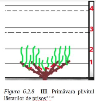 Plivitul trebuie efectuat la timp pentru a evita formarea rănilor mari. În perioada de vegetație, se face plivitul lăstarilor de prisos și se lasă 2 lăstari bine dezvoltați (figura 6.2.12).