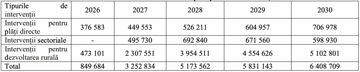 Pe termen mediu, politica agricolă propune o majorare progresivă a sprijinului financiar, de la 2,3 miliarde de lei în 2026 la 6,4 miliarde de lei în 2030, cu un volum cumulat de 21,5 miliarde de lei până în 2030.
