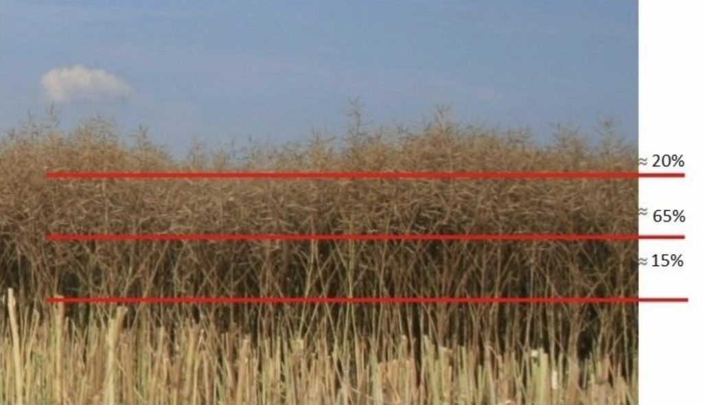 • la nivelul mijlociu, unde se află aproximativ 70% din recoltă, aproape 90% din semințe sunt de la roșu până la maro închis, unele negre și dure, sunt permise 10% seminte verzi și silicvele se mototolesc ușor fără a se rupe la rulare între degete, iar conținutul de umiditate al semințelor aproximativ 27%;
