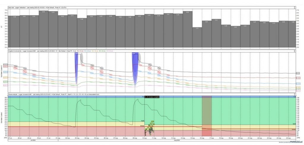 • senzorii de tip Granier pentru măsurarea fluxului de sevă înregistrează în mod continuu circulația sevei brute, oferind o estimare directă a ratei de transpirație a plantelor. Atunci când conținutul de apă din sol scade sub pragul optim, datele Sap Flow arată imediat o reducere a transpirației, ceea ce confirmă instalarea stresului fiziologic.