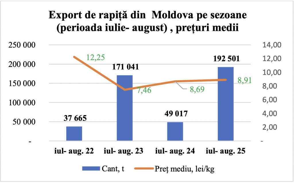 Astfel, sezonul curent se poziționează drept cel mai remarcabil atât din punct de vedere cantitativ, cât și valoric, confirmând rolul rapiței ca motor de creștere al exporturilor agricole ale Moldovei.