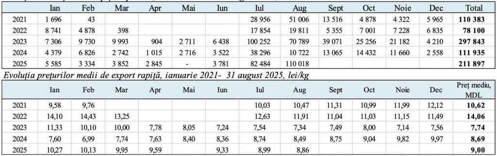 Prețul mediu de export din 2025 (8,91 lei/kg) a fost ușor mai mare decât în 2024 (8,69 lei/kg) și semnificativ peste nivelul din 2023 (7,46 lei/kg). Totuși, piața încă nu a revenit la valorile foarte ridicate din 2022, când media era de 12,25 lei/kg.