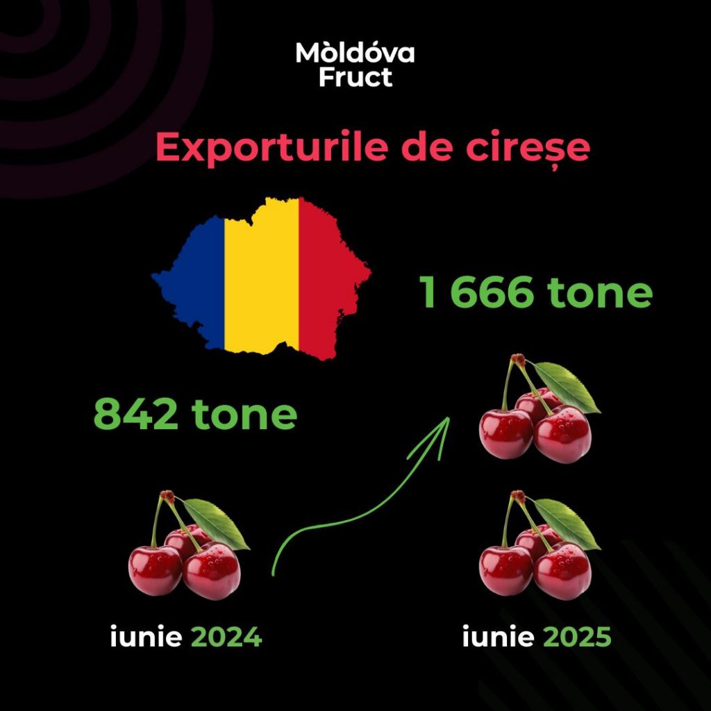 România devine unul dintre cele mai dinamice debușee pentru cireșele moldovenești. În iunie 2025, exporturile pe această piață aproape că s-au dublat: 1666 tone față de 842 în 2024, cu o valoare totală mai mare cu 65%.