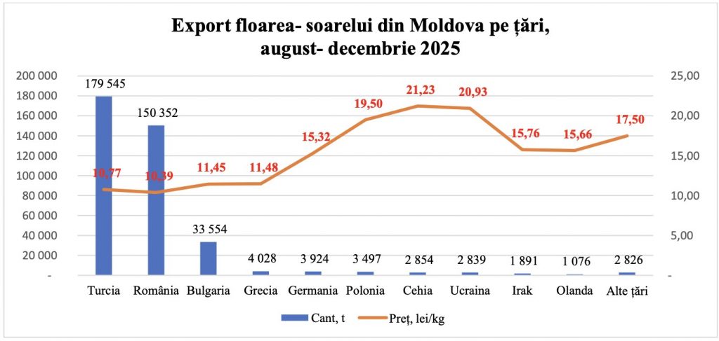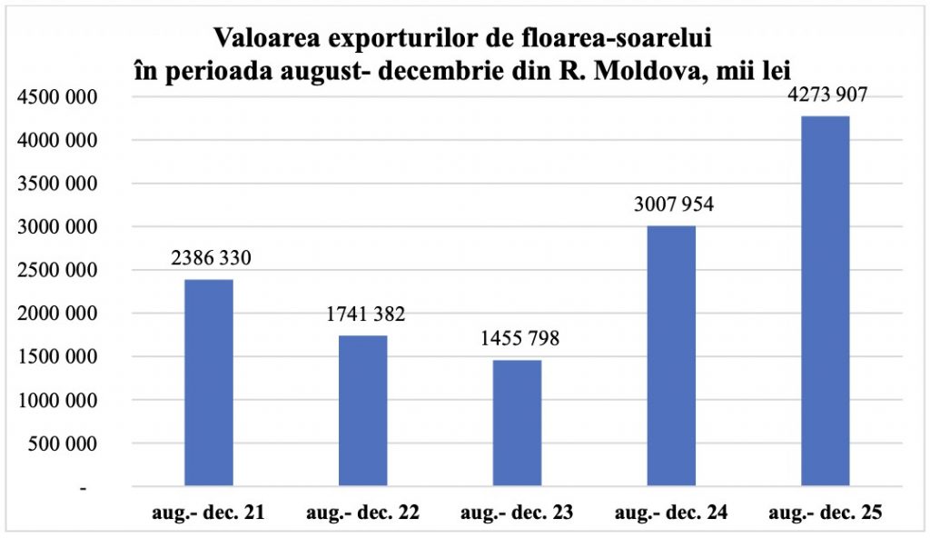 Ca efect direct al acestei dinamici, în august–decembrie 2025, Republica Moldova a încasat 4 miliarde 273 milioane lei din exporturile de floarea-soarelui.