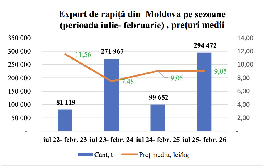 În perioada iulie 2025 – februarie 2026, au fost exportate 294 472 tone de rapiță, la un preț mediu de 9,05 lei/kg. Acest volum reprezintă un record istoric absolut, fiind cea mai mare cantitate exportată într-un sezon comparabil.