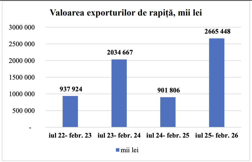 Din punct de vedere financiar, rezultatele sunt semnificative. Exporturile de rapiță brută au generat 2 miliarde 665 milioane lei, de trei ori mai mult decât în sezonul precedent.
