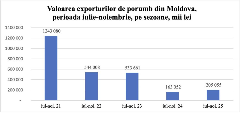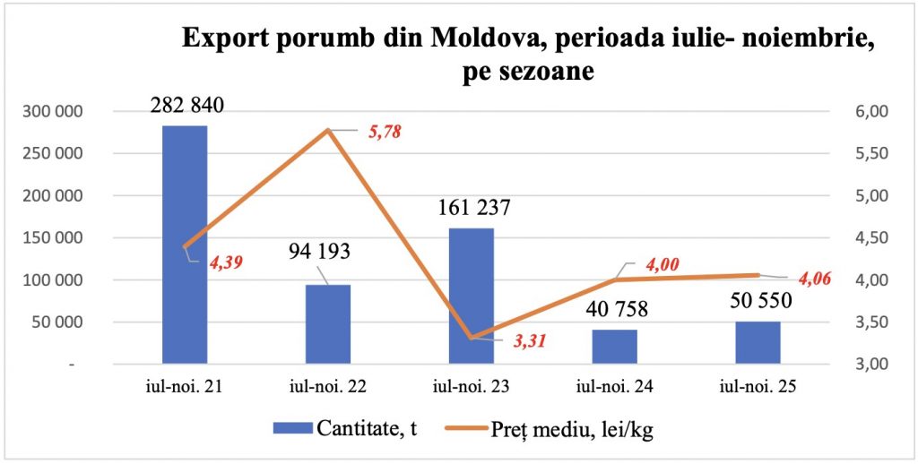 În luna noiembrie 2025, Republica Moldova a exportat 19 153 tone de porumb, la un preț mediu de 3,79 lei/kg.