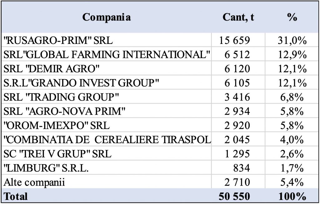 Urmează SRL „GLOBAL FARMING INTERNATIONAL”, cu 6 512 tone (12,9%), și SRL „DEMIR AGRO”, cu 6 120 tone (12,1%).