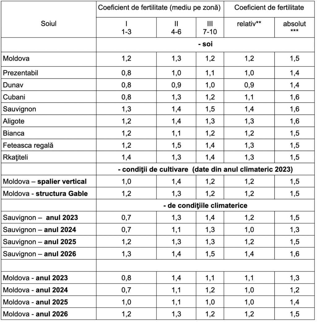 ***Coeficientul de fertilitate absolut reprezintă numărul total de inflorescenţe raportat la numărul lăstarilor fertili.