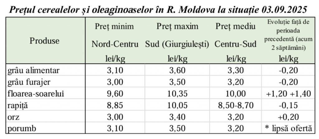 Traderii își orientează interesul spre alte culturi, în timp ce porumbul rămâne mai puțin atractiv. În portul Giurgiulești, prețul de achiziție se menține la 3,50 lei/kg, iar la elevatorul din Strășeni (Bucovăț) nivelul este de 3,25 lei/kg.