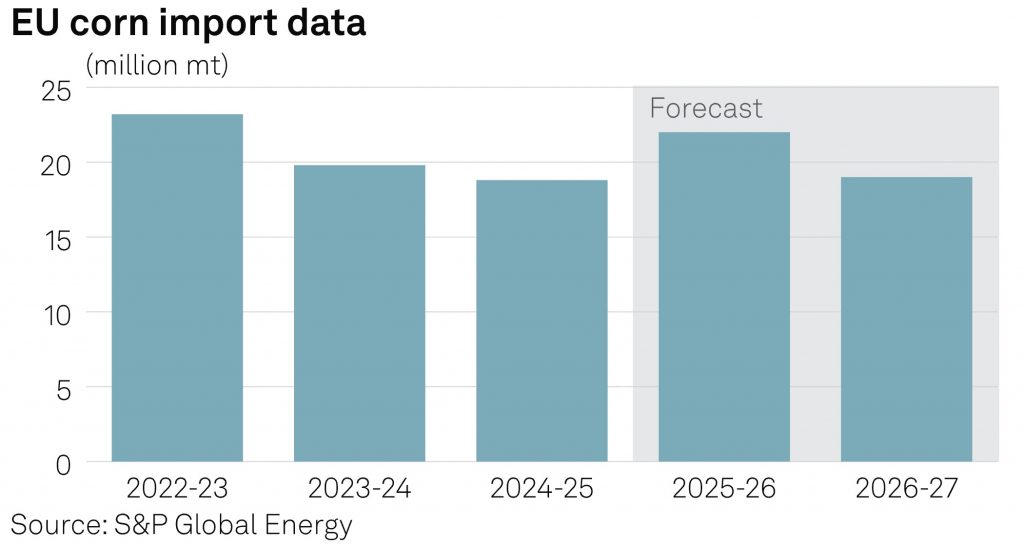 Potrivit S&P Global Market Intelligence – Global Trade Analytics Suite (GTAS), importurile de porumb ale UE au totalizat 18,79 milioane tone în anul de piață 2024–2025, în scădere față de 19,83 milioane tone în sezonul precedent.