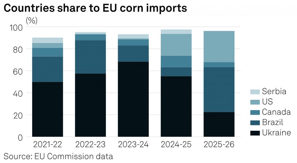 Pe măsură ce anul de comercializare a porumbului avansează, structura importurilor Uniunii Europene se modifică vizibil, sub influența contextului geopolitic, a problemelor logistice și a sensibilității ridicate la preț a principalilor cumpărători.