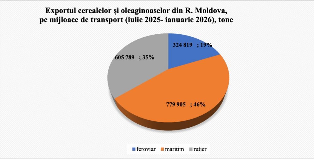 Din totalul volumelor livrate, 779 905 tone, adică 46%, au fost expediate pe cale maritimă. Din 2023, segmentul naval a depășit transportul rutier și s-a impus ca axă logistică centrală pentru exporturile agricole.