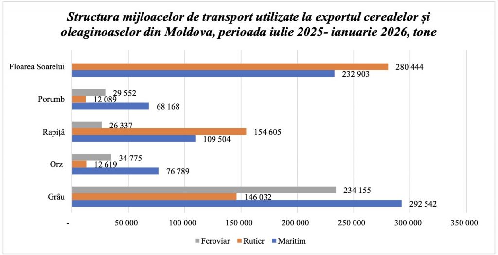 În transportul feroviar predomină grâul – 234 155 tone, urmat de orz și porumb, ceea ce confirmă utilizarea căii ferate pentru cereale cu volum mare și marje reduse.