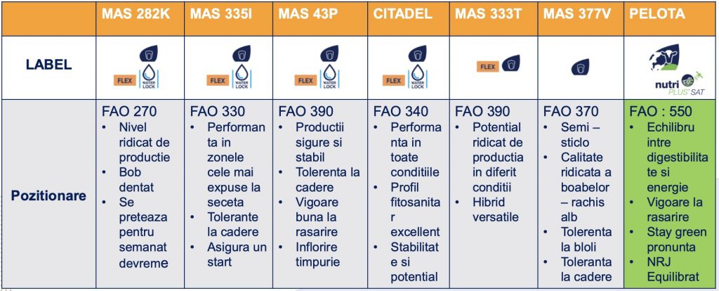 În ceea ce privește porumbul, Mas Seeds propune hibrizi din grupe FAO variate, de la FAO 270 până la FAO 390, dar și un hibrid destinat producției de siloz.
