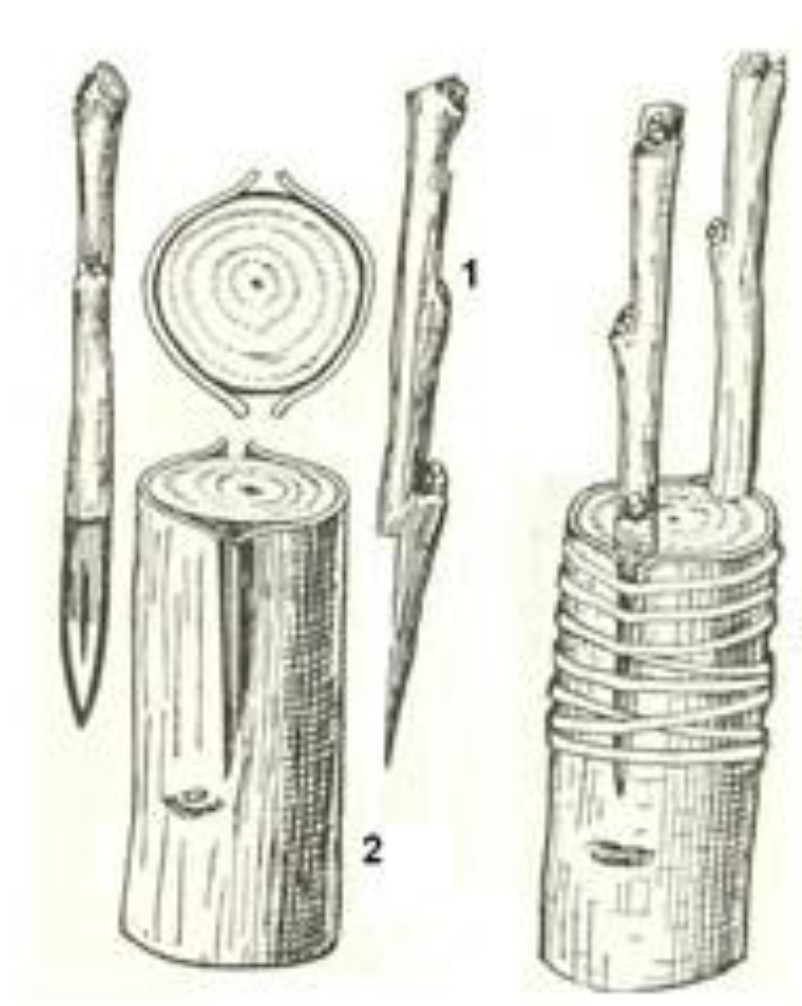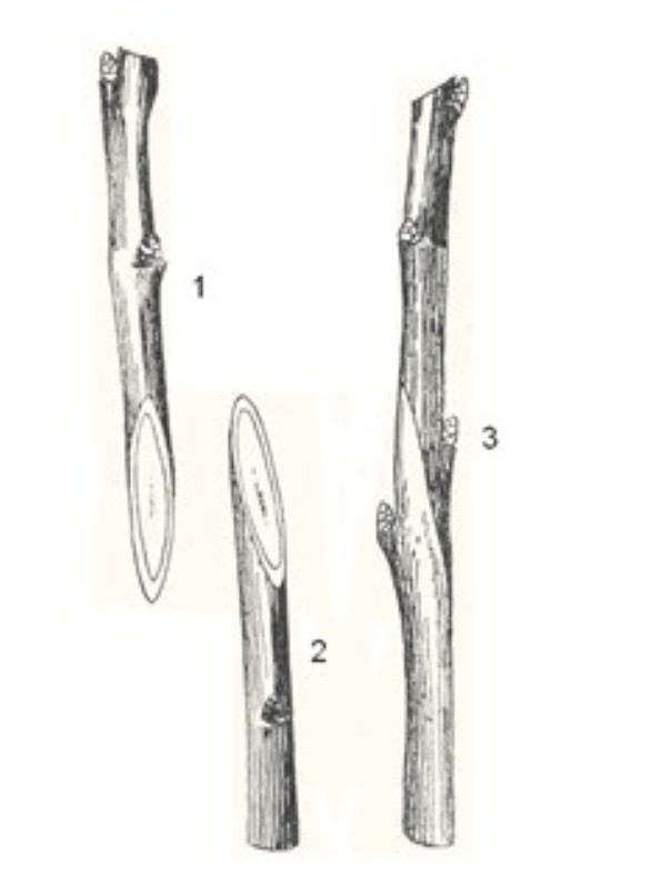 Copulație simplă: Se unesc altoiul și portaltoiul de diametre similare printr-o tăietură diagonală. Zona este fixată cu bandă și acoperită cu mastic.