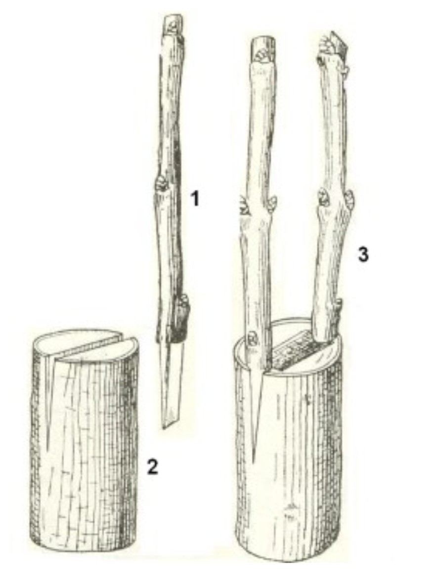 În despicătură: Portaltoiul este despicat la mijloc, iar altoiul este introdus sub formă de pană. Este o metodă simplă, potrivită pentru începători.