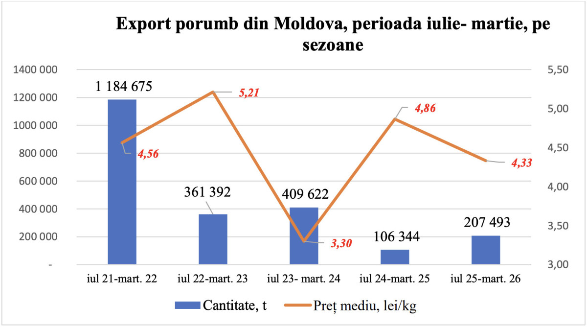 În sezonul 2021–2022, încasările din exportul de porumb au atins 5,4 miliarde lei, de aproape șase ori mai mult decât în prezent. În 2022–2023, valoarea depășea încă 1,88 miliarde lei, confirmând reculul din ultimii ani.