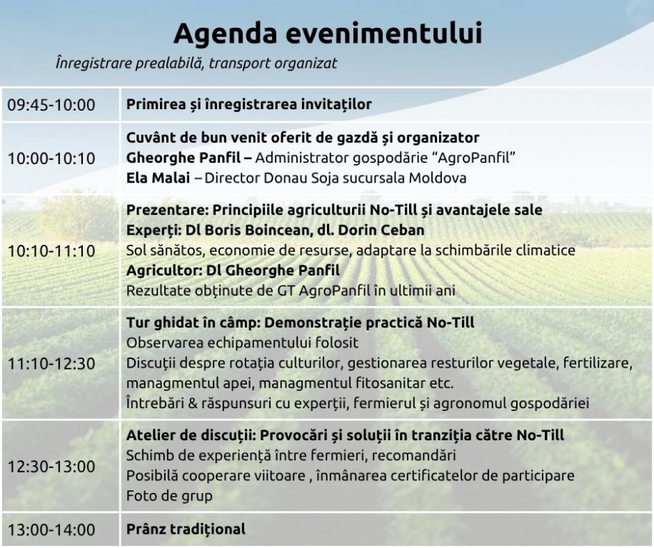 Pe 29 mai 2025, între orele 10:00 și 13:00, fermierii și specialiștii din domeniul agricol sunt invitați să participe la o vizită profesională dedicată practicilor No-Till, organizată de Donau Soja Moldova.