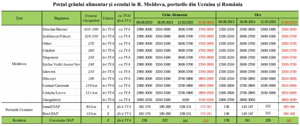 „În Republica Moldova prețul grâului alimentar cu care începe sezonul 2025/2026 este unul modest, de 3.100-3.200 lei/tonă în portul Giurgiulești, iar în nordul țării – 2.700 -2.800 lei/tonă.