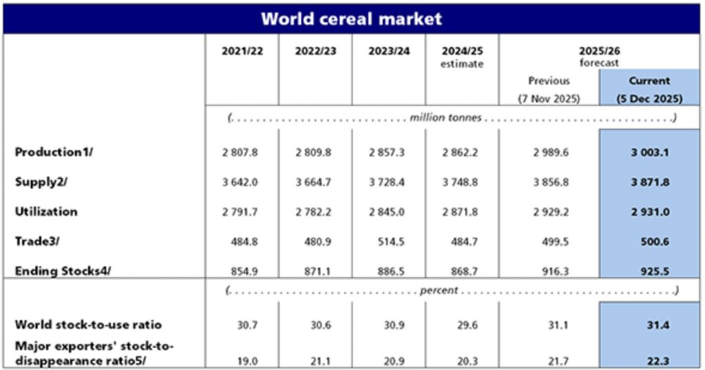FAO și-a revizuit în creștere prognoza pentru producția mondială de cereale în 2025, care ajunge la 3 003 milioane de tone, marcând pentru prima dată depășirea pragului de 3 miliarde de tone la nivel global.