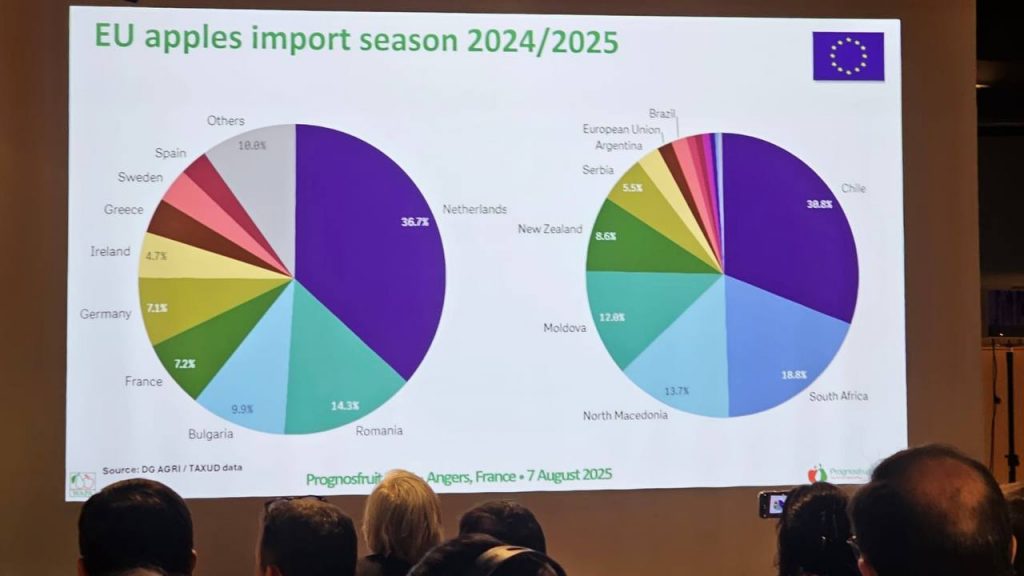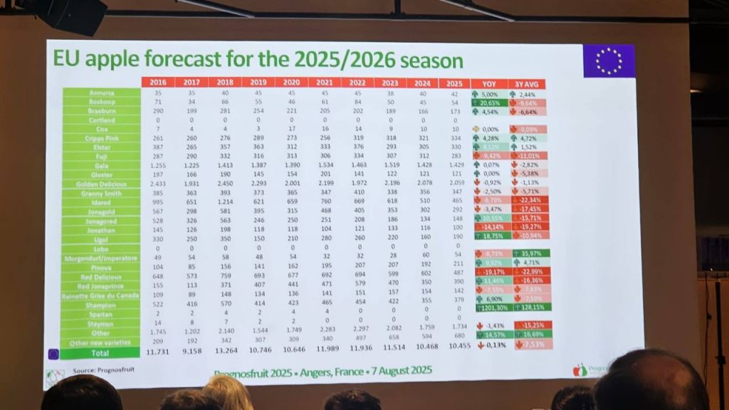 „În Uniunea Europeană, tendința generală indică o scădere a producției de mere față de media ultimilor ani, cu 7,5% sub nivelul perioadei de referință, chiar dacă volumul estimat pentru 2025, de 10,46 milioane tone, se menține aproape de cel din 2024 (-0,1%).