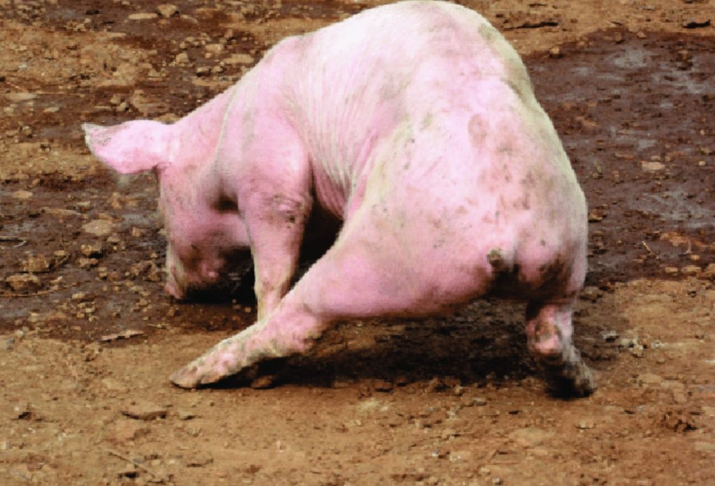 La purcei apar accese de tetanie, mers instabil și poziții anormale („în genunchi” sau „ca un câine șezând”).