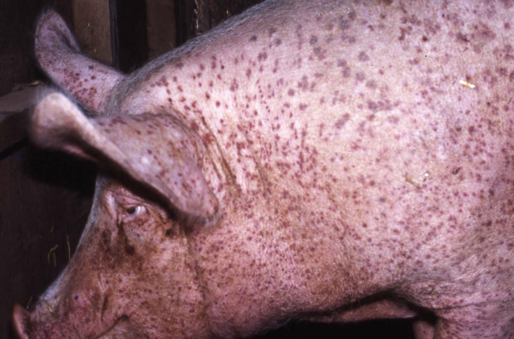 - Pierderea părului: În zonele afectate, porcii pot pierde părul, iar pielea devine îngroșată și cheratinizată.